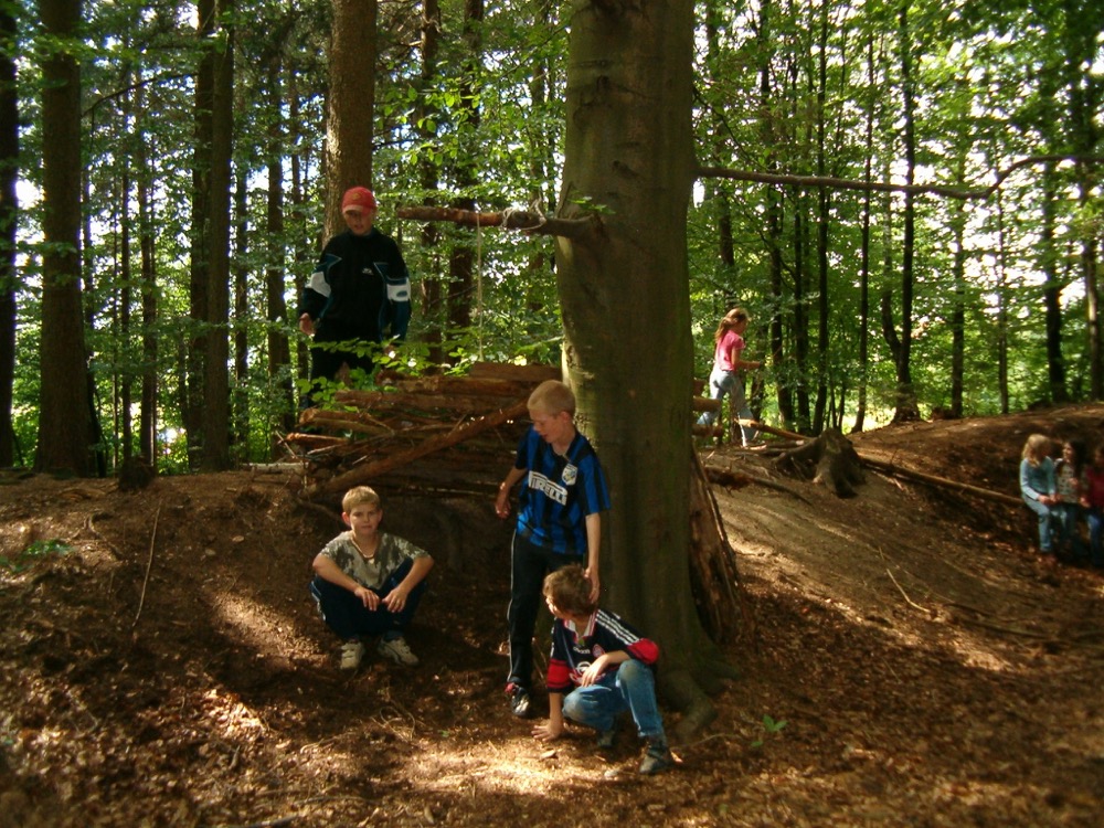 Einen Feriennachmittag verbrachten wir mit 20 Kindern am Gelände des Soyener Baumlehrpfades. Es ist ein zum Teil sumpfiges Wiesengelände mit Bachlauf (Biotop), das von zwei Seiten mit Buchenwäldern eingesäumt ist. An drei Seiten des rundum führenden Wiesenweges sind heimische Bäume und Sträucher gepflanzt, von denen 40 mit Namen und allem Wissenswertem zur Pflanze beschildert sind. Ein idealer Platz für unsere Waldspiele.