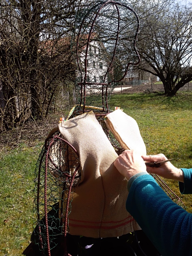 Hanni Köbinger half, das Mieder des Dirndls aus Kaffeesäcken händisch direkt ans Gestell dran zu nähen, und Rosi gestaltete perfekt mit Drahtgerüst und Moos den Kopf, Arme und den eleganten Hut des Dirndls.
