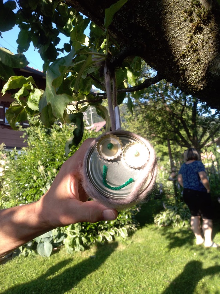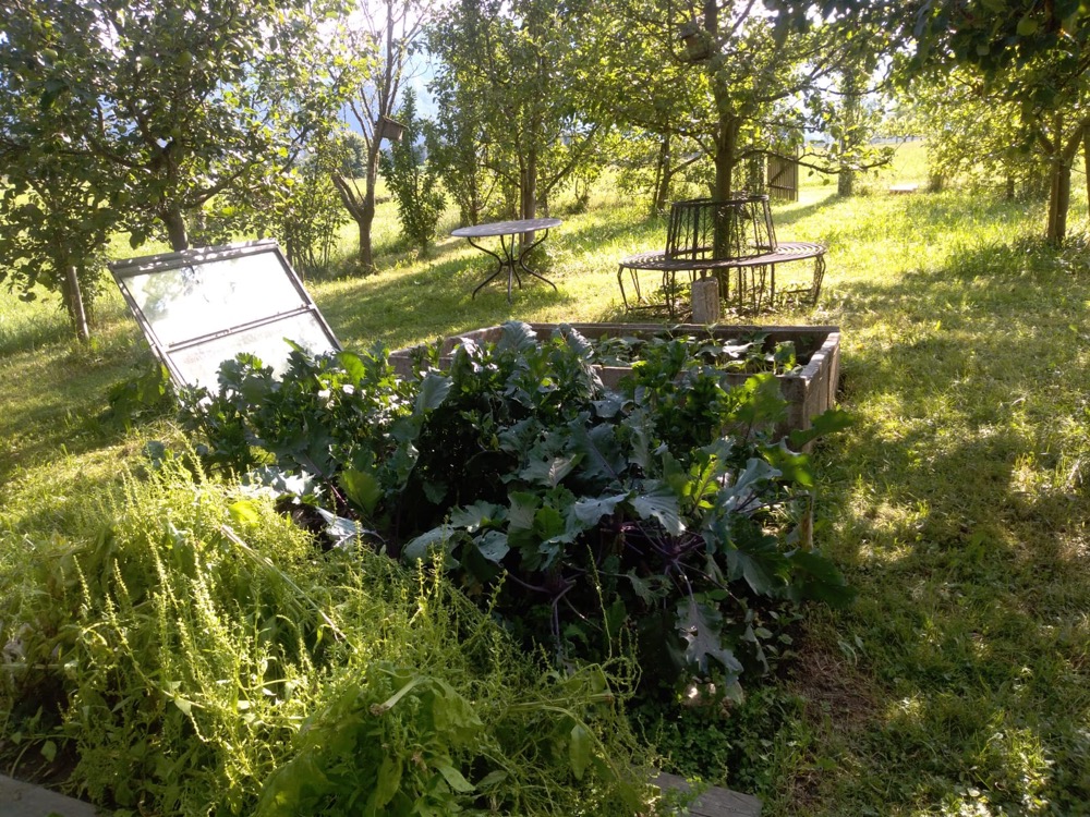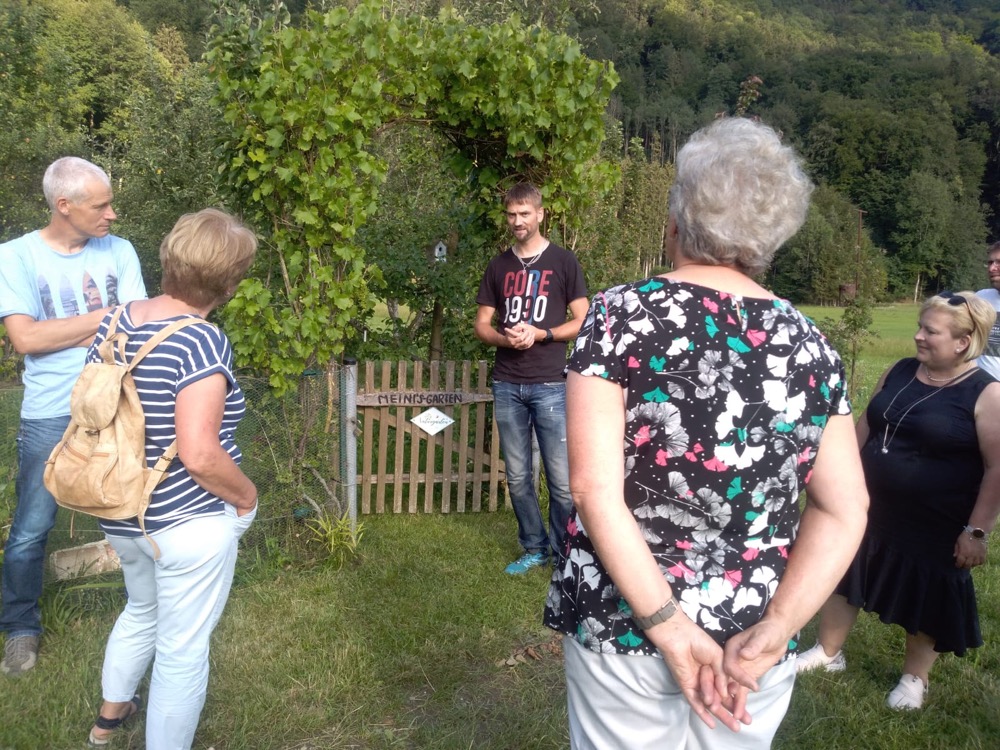 Bei herrlichem Wetter besichtigten wir nach einem Spaziergang zunächst einen außergewöhnlichen Obstgarten mit Streuobstwiese, Beerensträuchern und Weinreben. Ein überaus vielfältiger Sortenreichtum brachte uns alle zum Staunen. Aber nicht nur Obst, auch Gemüse wird dort zwischen Baumreihen erfolgreich für den Eigenbedarf angepflanzt.