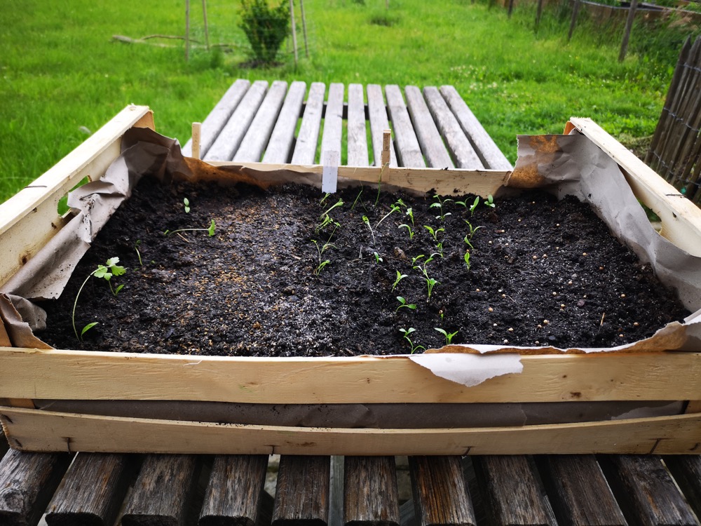 Für die Anpflanzung und Aussaat wurden Gemüsesorten ausgewählt, die sich gut für die Monate April/Mai eignen: Rote Beet, Kohlrabi, Salat, Zwiebel, Karotten, Radieschen. Kräuter kann man in die Seitentaschen des Hochbeets setzen (Schnittlauch, Kerbel, Knoblauch…).