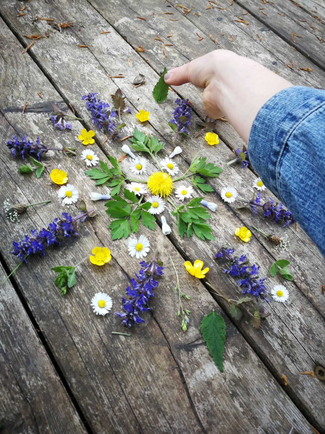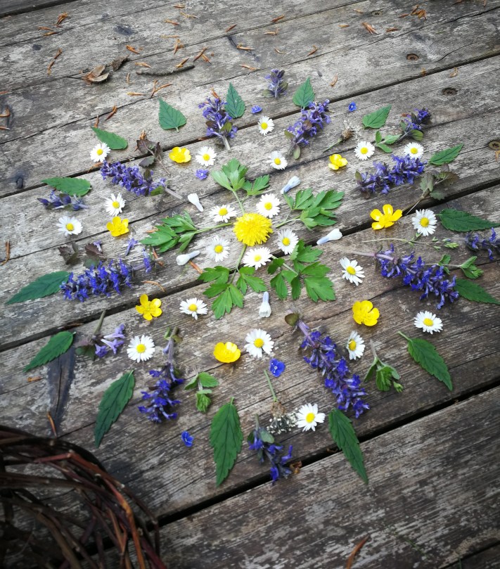 Aus den gesammelten Blüten und Blättern lässt sich nun ein schönes Bild legen. Sucht euch einen Platz auf der Terrasse oder im Garten aus. Wir beginnen in der Mitte und legen im Kreis so lange bis die gewünschte Größe erreicht ist. Eure Eltern und Freunde werden staunen, was man alles aus Pflanzen machen kann.