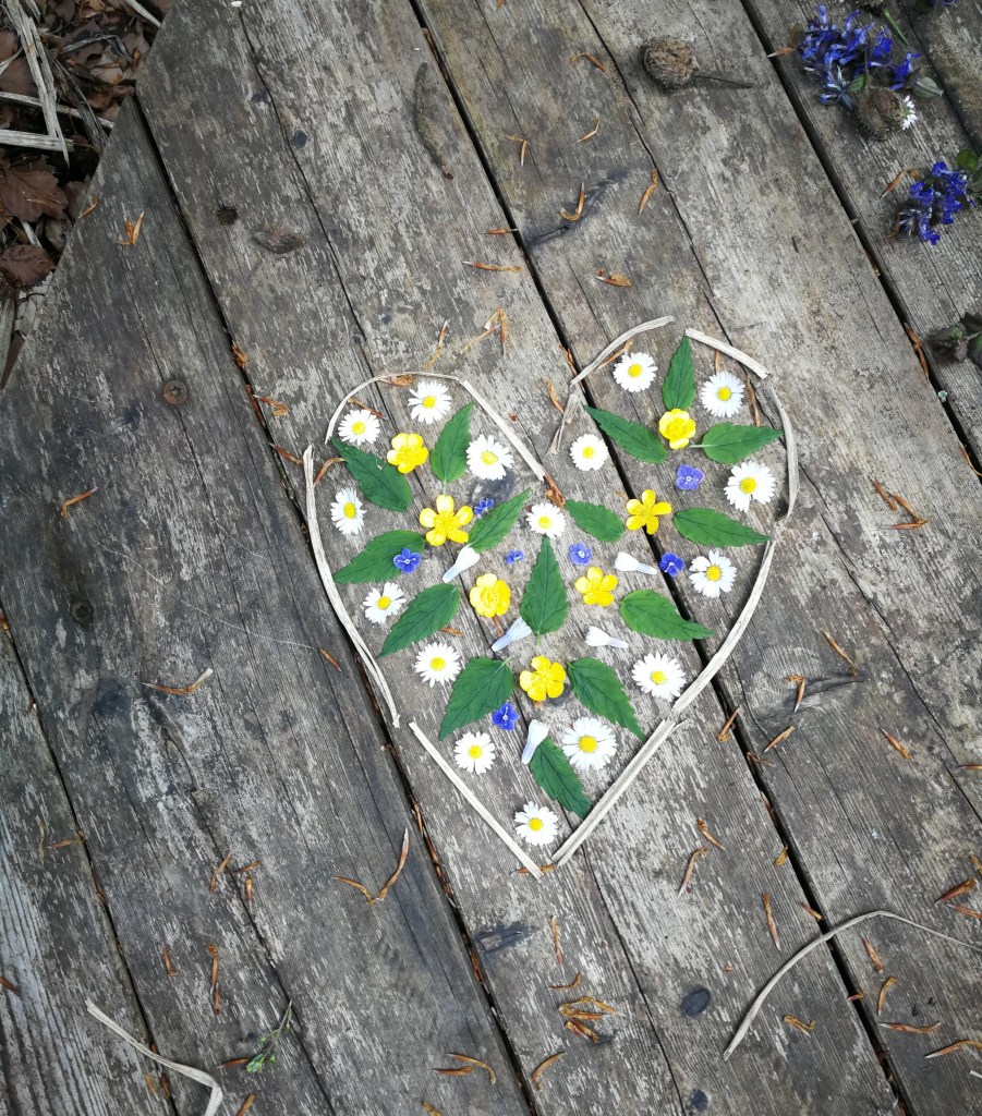 Wir legen ein farbenfrohes Mandala aus Blüten und Blättern.