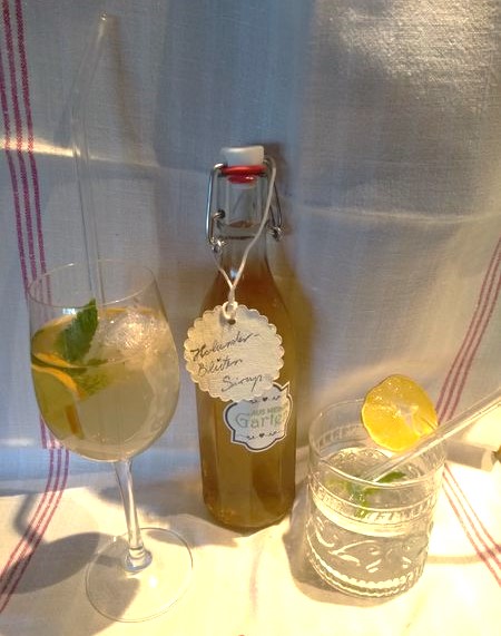 Man gibt 2 kg Zucker in 2 Liter Wasser und löst diesen durch langsames Erwärmen auf. Etwa 20 Holunderblüten werden vorsichtig abgeschüttelt, um kleine Insekten zu entfernen. 3-4 Bio-Zitronen schneidet man in Scheiben und gibt sie in das abgekühlte Zuckerwasser. Auch ein wenig Zitronensäure rührt man ein, für Spritzigkeit und zur Konservierung. Zum Schluss legt man die Blüten in den Sirup und rührt vorsichtig um. Das Ganze lässt man ein bis zwei Tage ziehen. Danach wird der Sirup durch ein feines Sieb gegossen und in saubere Flaschen abgefüllt. Die Sirup-Flaschen müssen kühl gelagert werden, um den Gärprozess zu verlangsamen. Aufgegossen mit Mineralwasser oder auch Sekt schmeckt der Holunderblütensirup hervorragend!