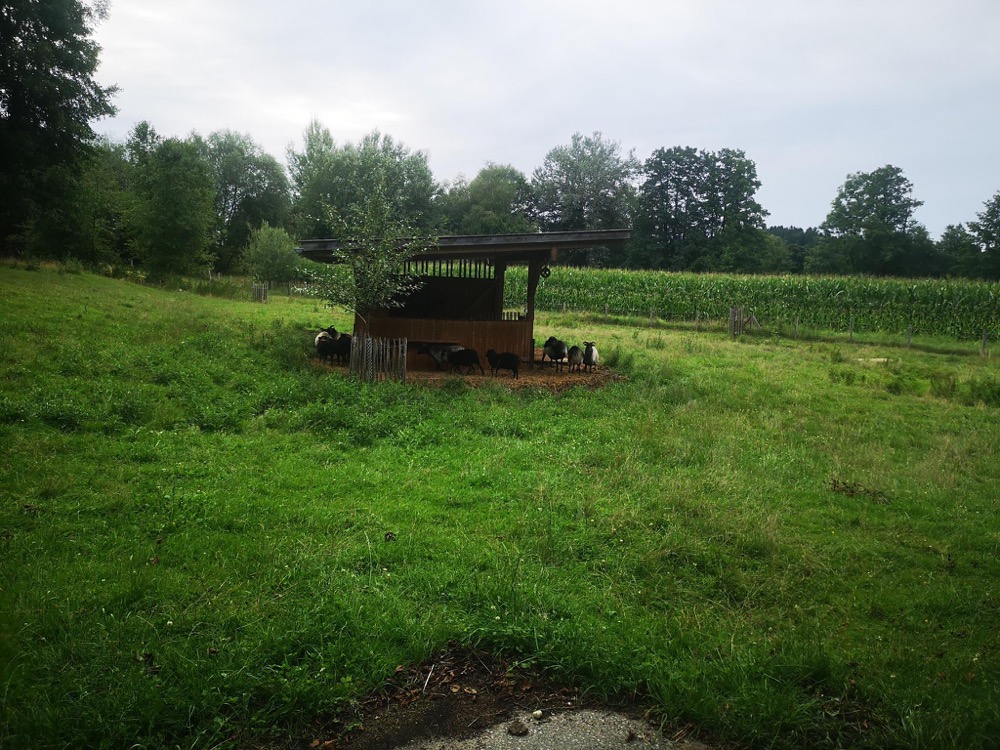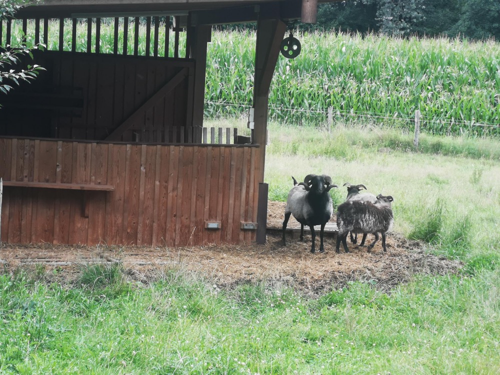 Neben den Hühnern gibt es Schwarzkopfschafe, die bei der Offenhaltung der Wiesen und Weiden, der Herstellung von Kompost, der Ernährung und der Gewinnung von Wolle helfen.