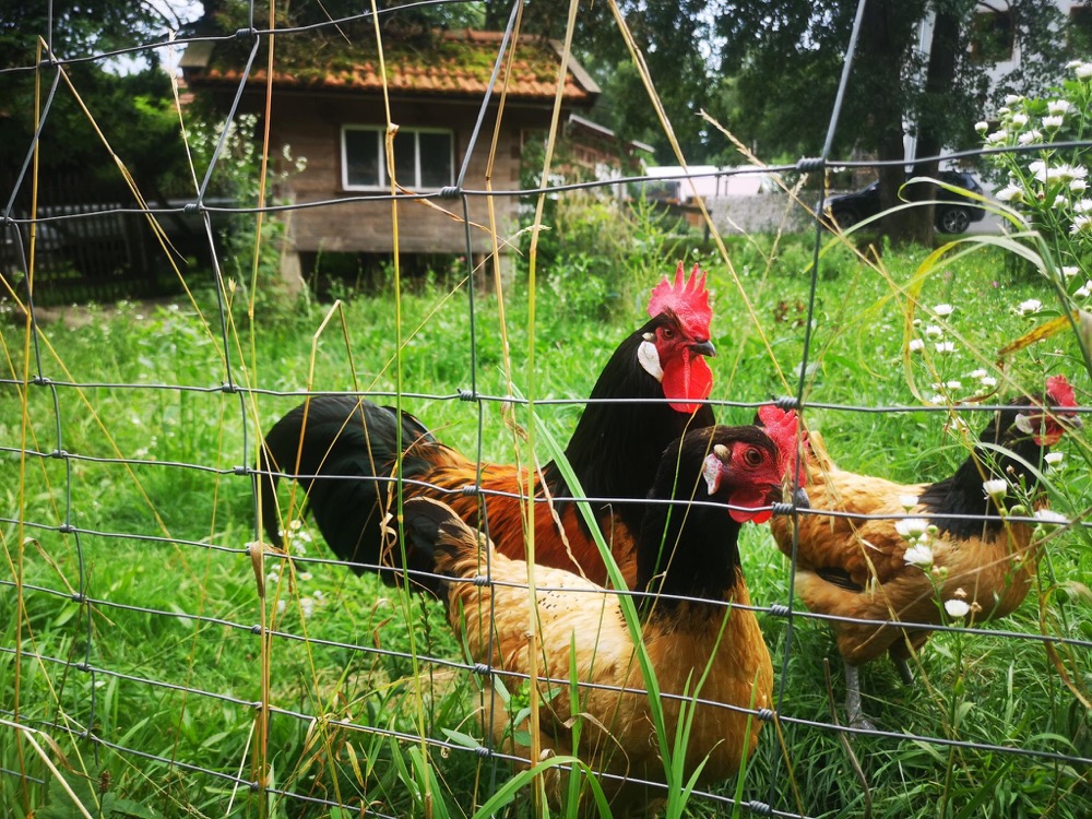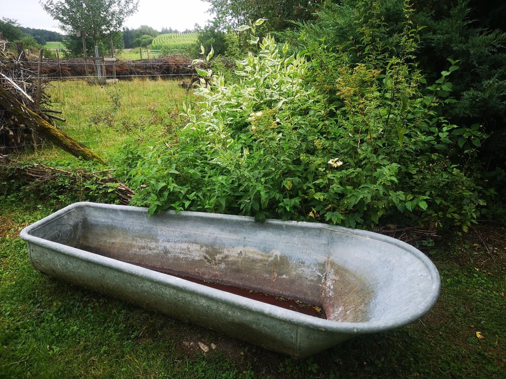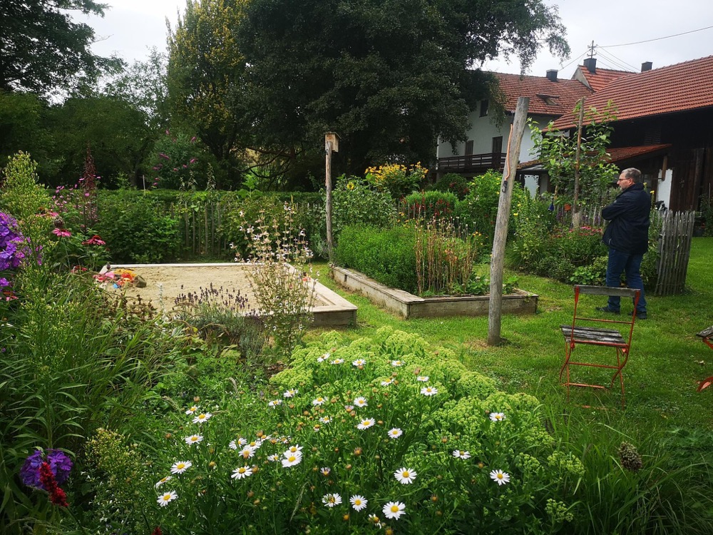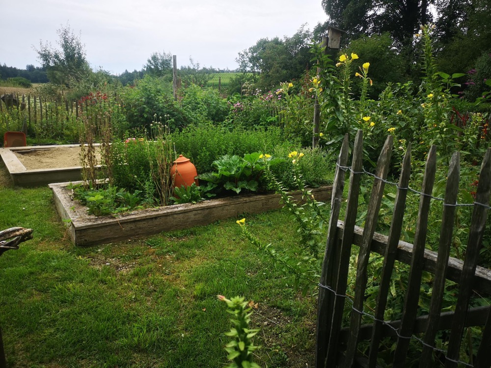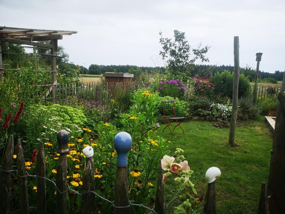 Mit Hühnern, Schafhaltung, fast Selbstversorgung, im Einklang mit der Natur. Ohne Handelsdünger, keine Spritzmittel, mit vielen Stauden, Kräutern, Gemüse und selbst gezogenen Bäumen.