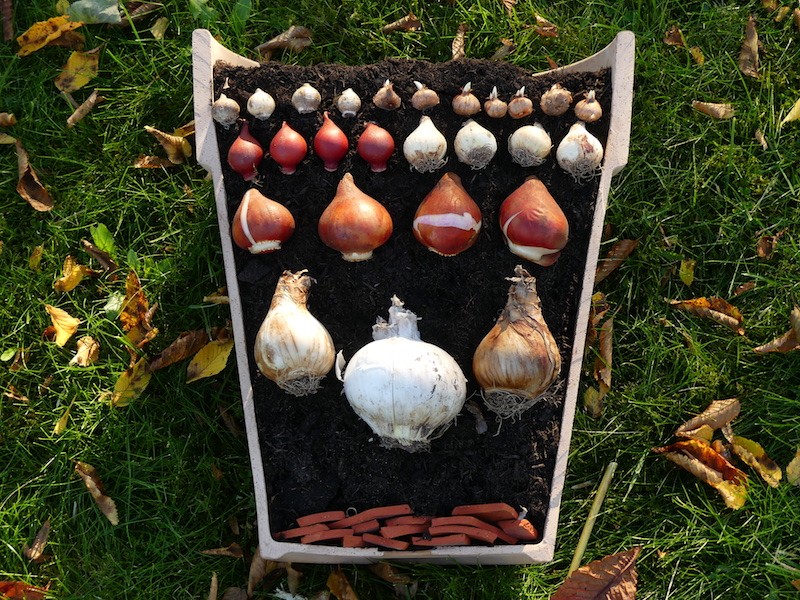 Man pflanzt Blumenzwiebeln in verschieden Etagen. Das bedeutet, dass die unterschiedlichen Blumenzwiebeln in Schichten übereinander gepflanzt werden, wie bei einer Lasagne.