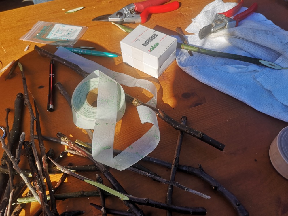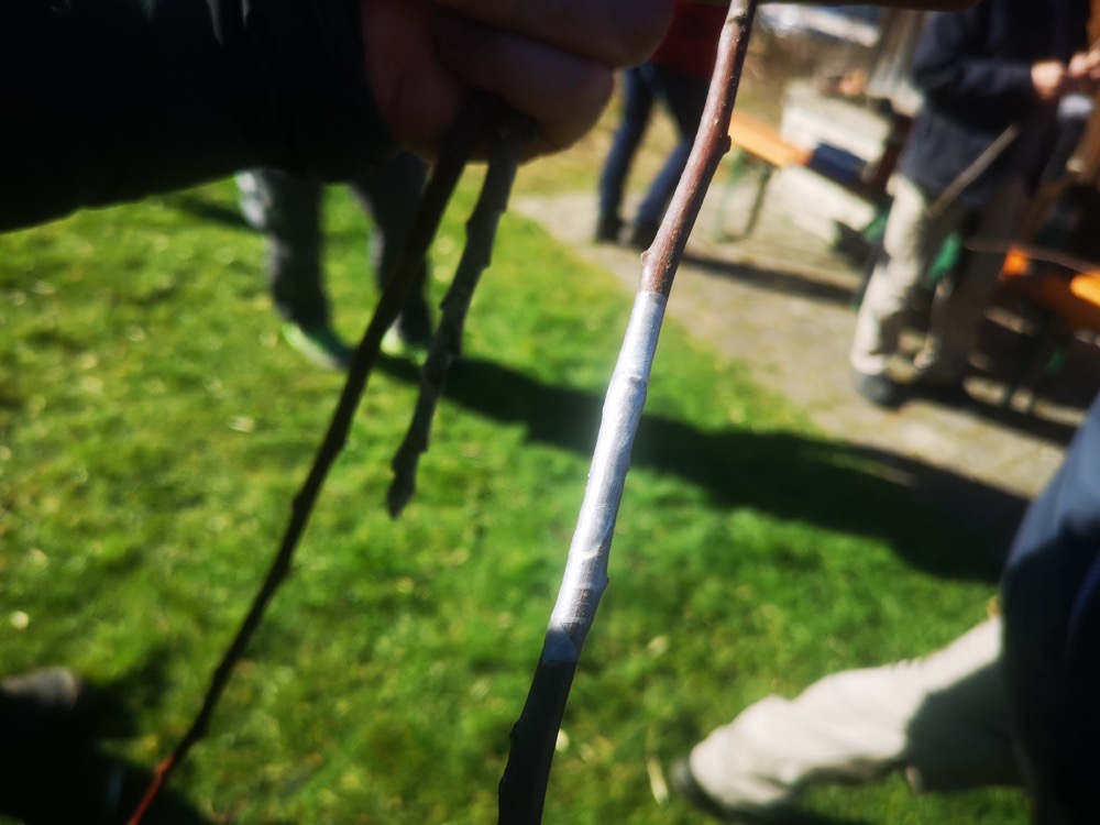 Dann wurde die Unterlage (schwach – M26 oder starck – Sämmling) erklärt, sowie die Techniken zum Verbinden mit Wachs oder biologisch abbaubarem Band.