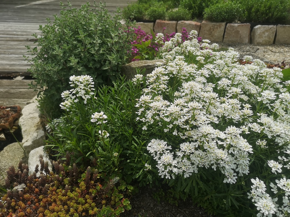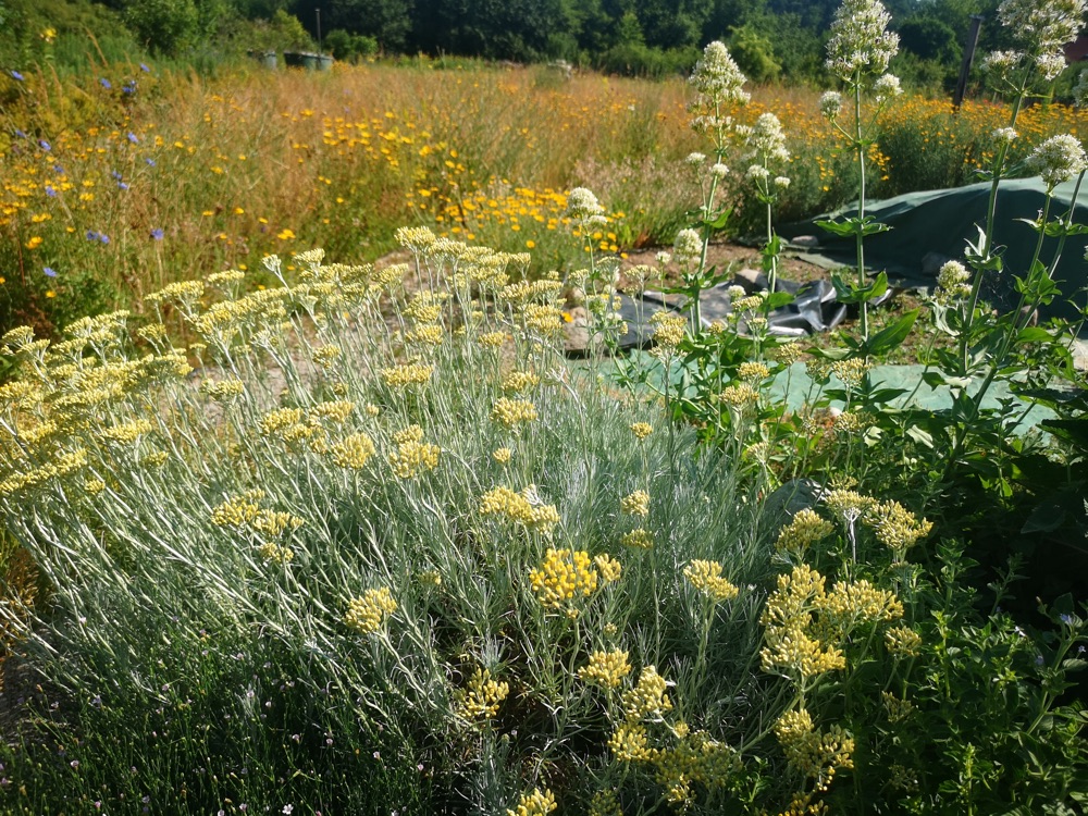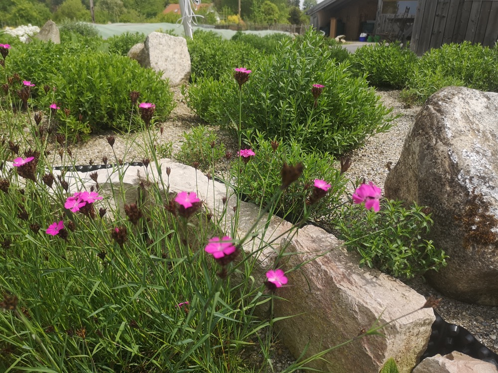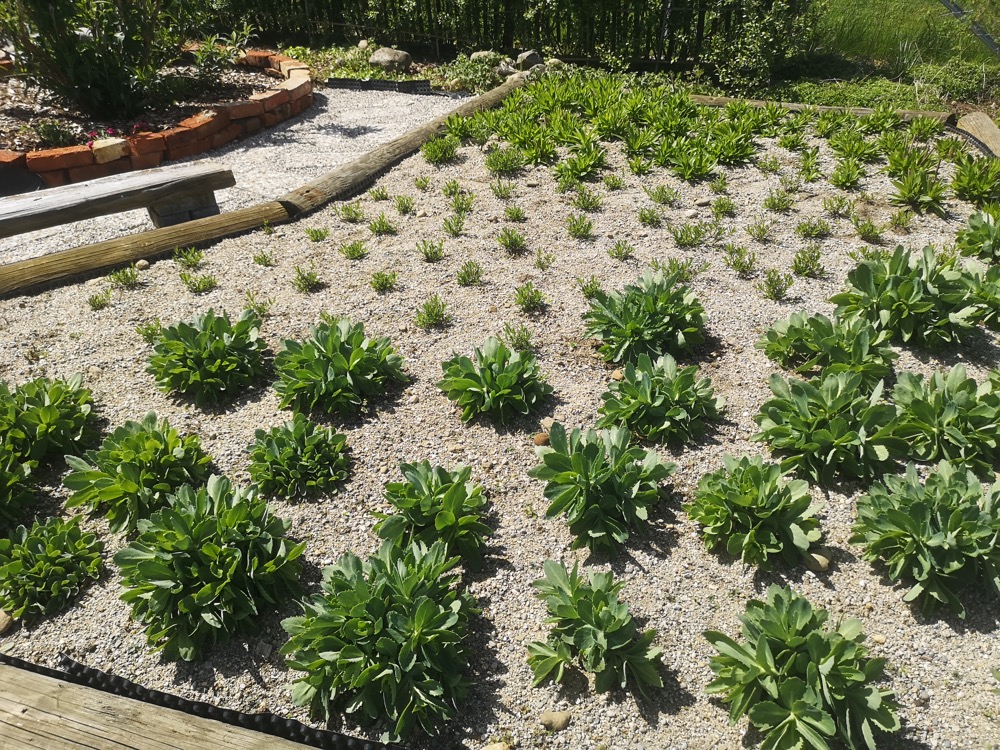 Auf der Tagesordnung dieses Treffens stand auch das trockene Staudenbeet in kleinen erhöhten Beeten mit Stein- oder Holzeinfassung (etwa 25 cm hoch). Sie alle haben ein gemeinsames Merkmal: eine 5 bis 10 cm dicke Sandschicht über der normalen Gartenerde. Der Sand wird nicht mit der Erde vermischt, sondern dient als mineralischer Mulch und verhindert Wasserverdunstung und Bodenerosion. Es sollte grober, ungewaschener Sand sein. Die Pflanzen entwickeln sich gut, die Wurzeln werden angeregt, tief zu wachsen, und der Boden ist voller Leben, wie die Regenwürmer am Anfang der Saison zeigen.
