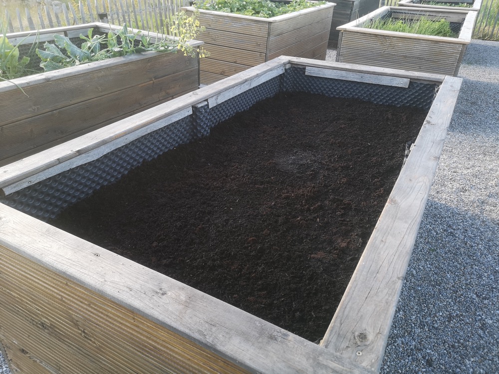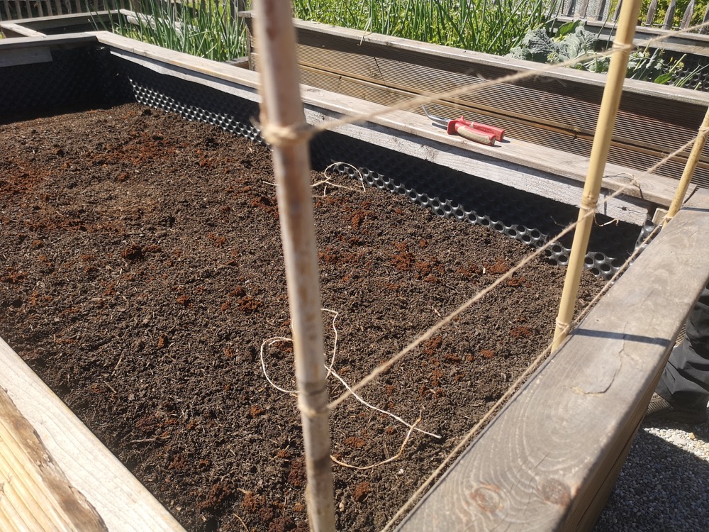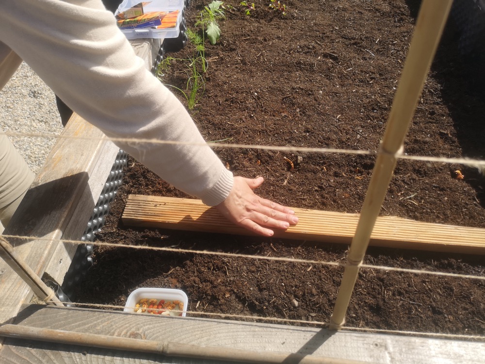 Da es sich bei dem gepflanzten Gemüse um Schwachzehrer handelt, wurde nur eine dünne Schicht Kompost aufgebracht. Die Karottensamen wurden mit einem Brett abgedeckt, um die Feuchtigkeit zu bewahren und die Keimung zu beschleunigen. Wenn man sich für diese Technik entscheidet, muss man sie im Auge behalten. Sobald der Samen zu keimen beginnt, wird das Brett entfernt.