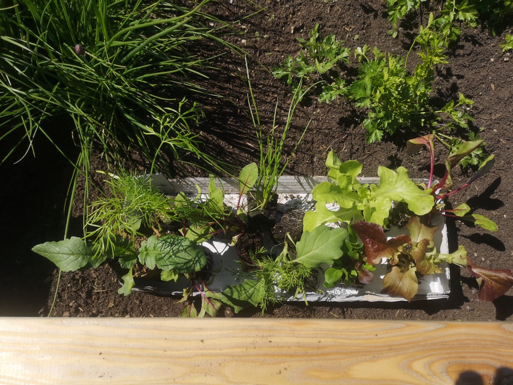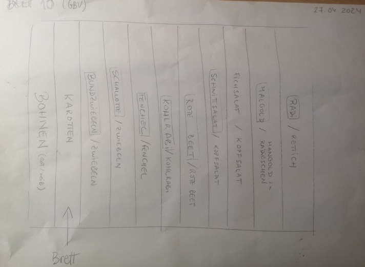 In einem 200×100 cm großen Hochbeet wurden 11 Reihen Gemüse gepflanzt und gesät, was dem Motto entspricht: Vielfalt und eine lange Ernte sind auf kleinem Raum möglich.