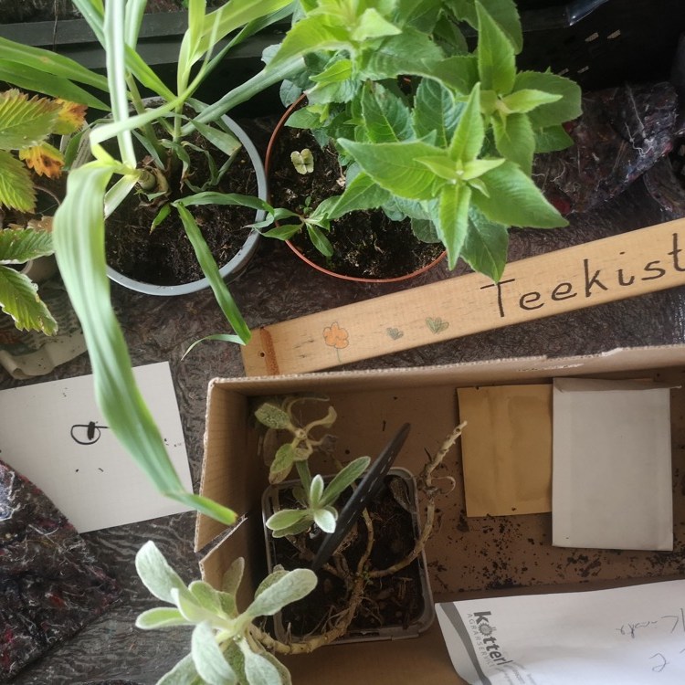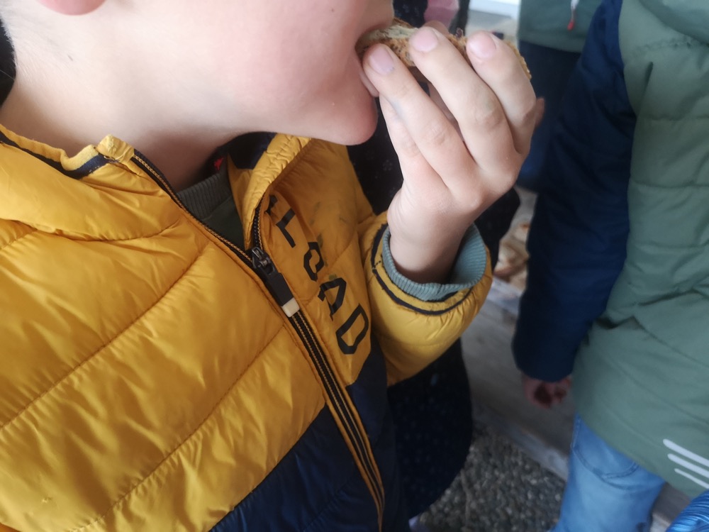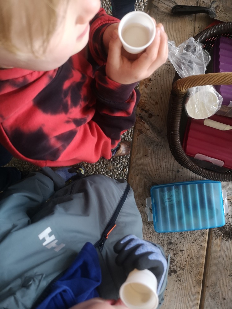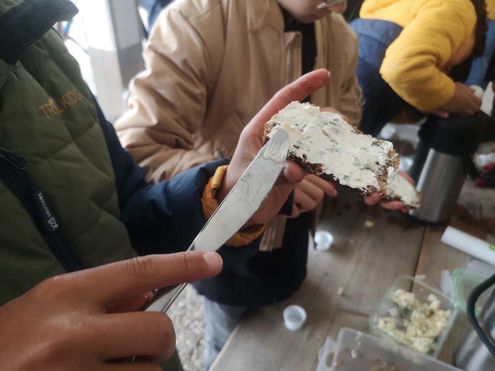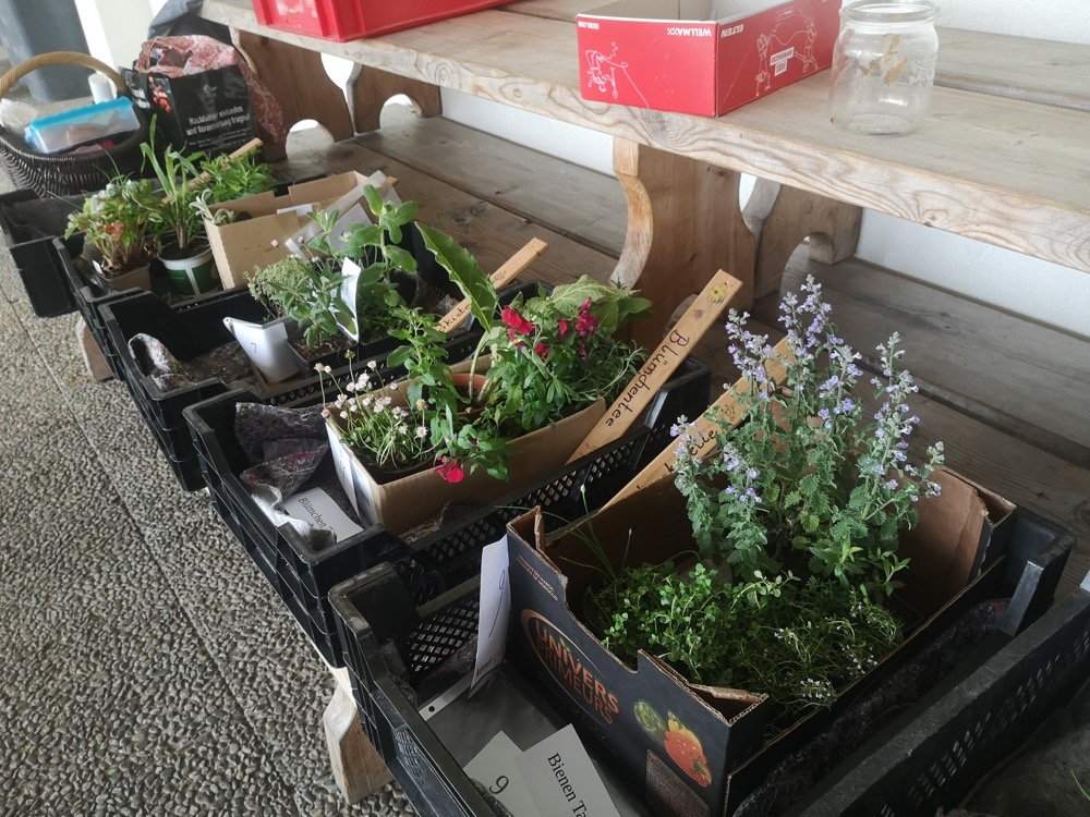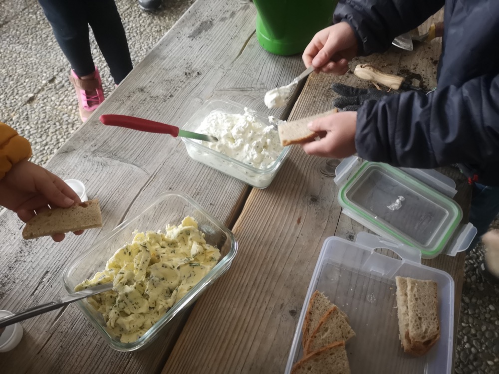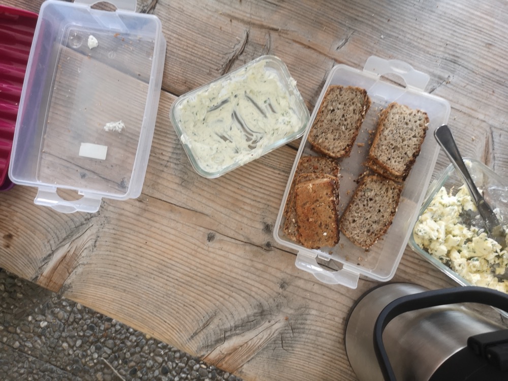 Nach der Arbeit war es natürlich Zeit zum Genießen: Blümchentee (wie eine der Kistenpflanzen), Brot, Kräuterbutter und Frischkäse.