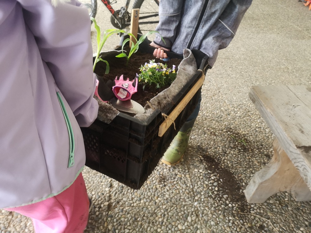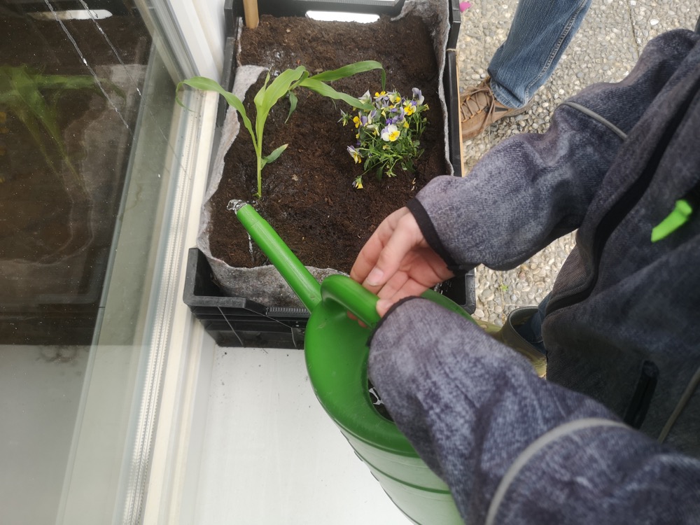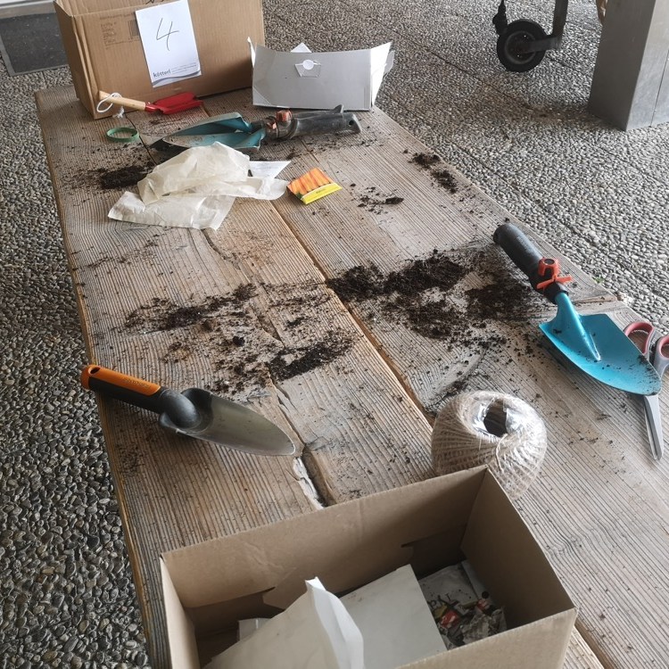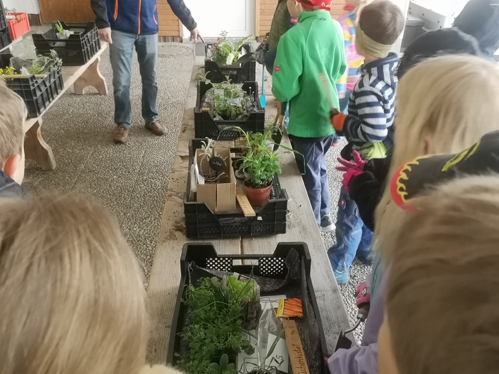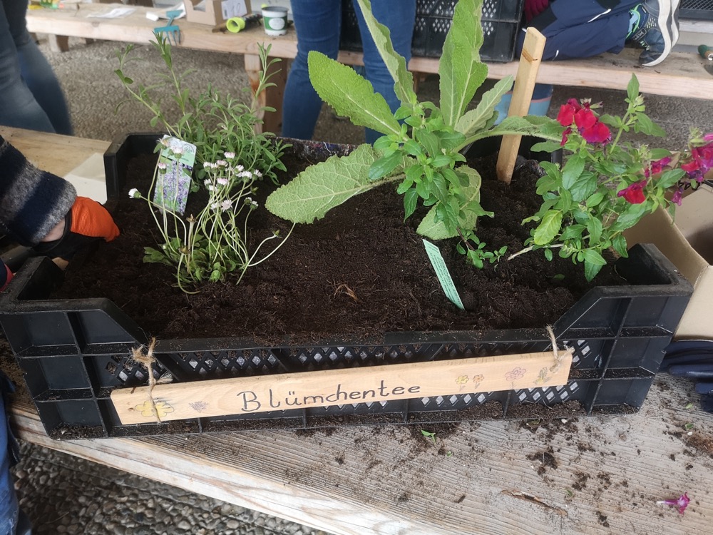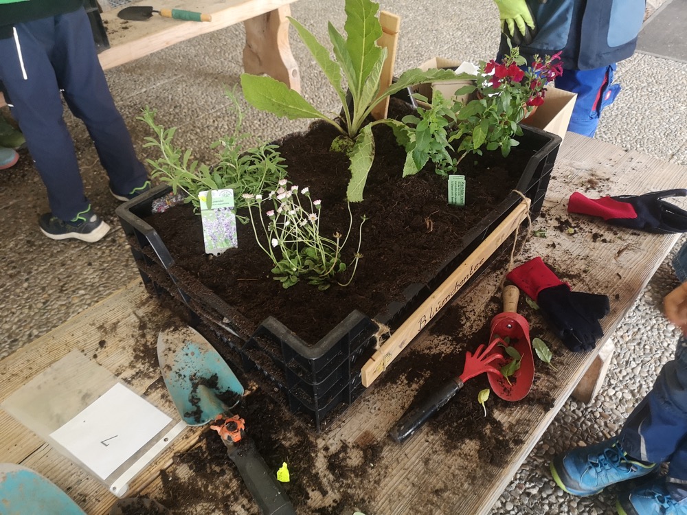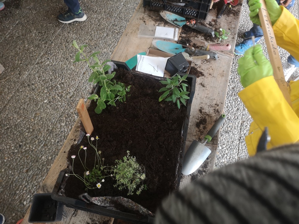 Wie die Ameisen haben alle ihre Arbeit gemacht, und bald waren die Kisten fertig. Schön, dass diese praktische Arbeit von den Lehrerinnen so gut vorbereitet wurde. Mehr noch, sie sind auch nach der Anpflanzung weiter mit den Kindern zuständig. Rosi erinnerte uns im Namen des GBV an die wichtige Bedeutung der Bewässerung und warnte zudem vor der Gefahr einer Vergiftung durch bestimmte Pflanzen wie Tomaten- und Kartoffelblätter.