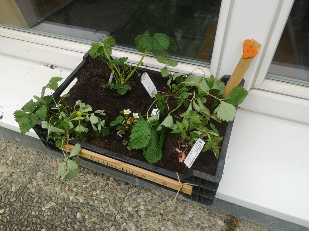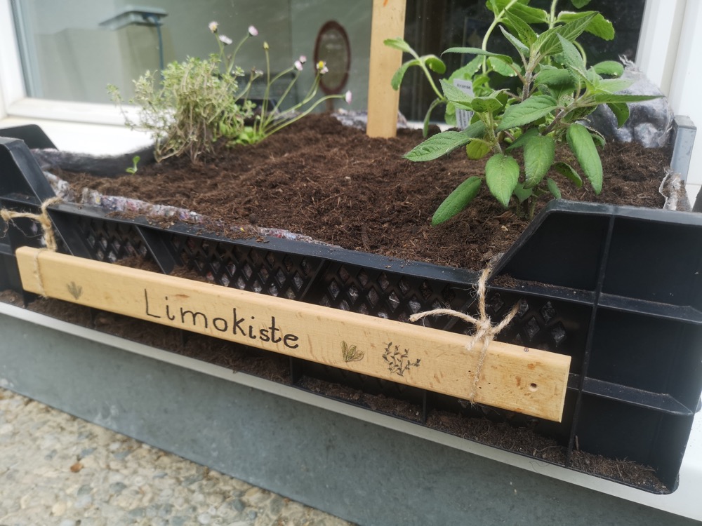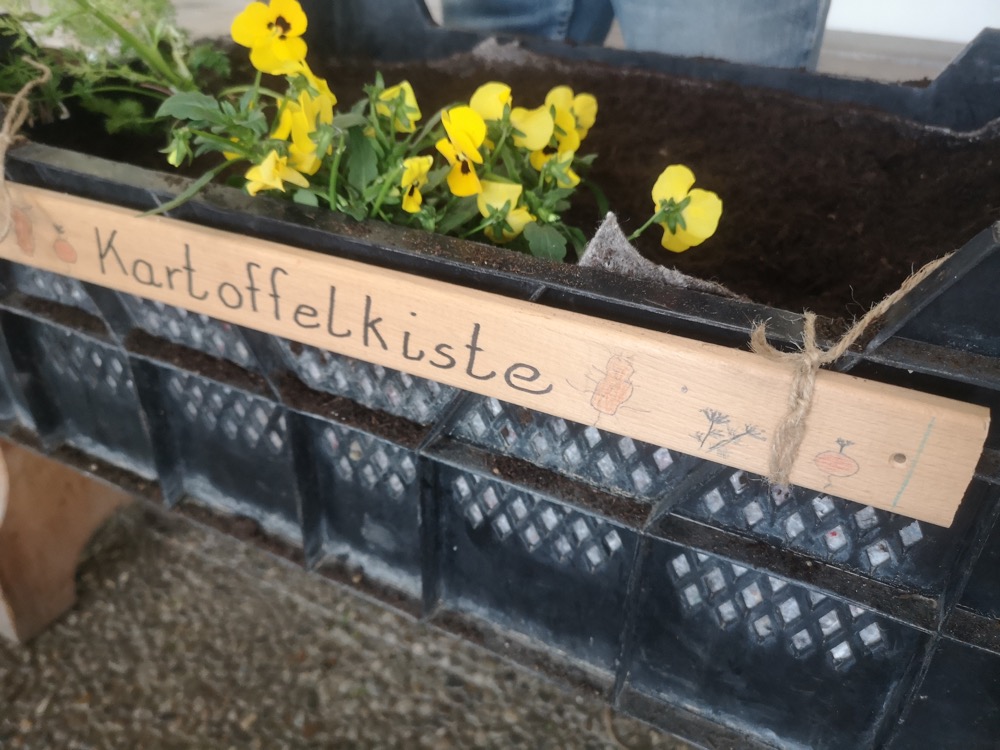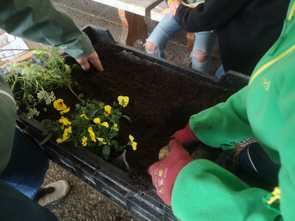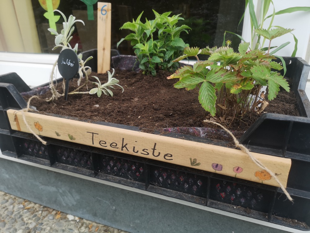 Elf Kisten wurden von zwei Klassen mit frischer Erde befüllt und neu bepflanzt. Jede Kiste steht unter einem bestimmten Thema, und im Gesamten bietet sich eine interessante Vielfalt.