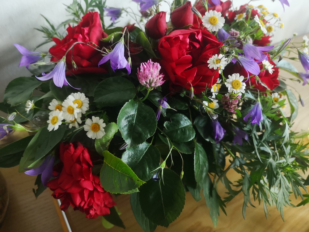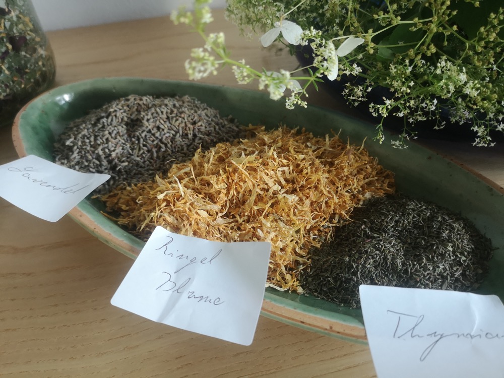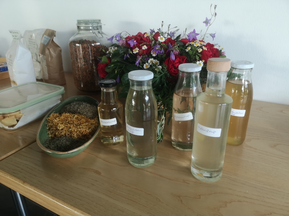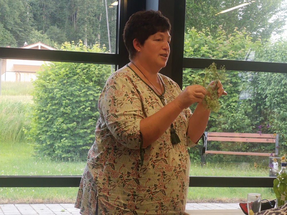 Einige der genannten Pflanzen: Brennessel, Frauenmantel, Johanniskraut, Schafgarbe, Spitzwegerich, Giersch, Holunder, Ysop, Gänseblümen, Löwenzahn, Rosen, Ringelblumen, Rotklee, Labkraut, Margerite, Borretsch, Mutterkraut, Gundermann, Beifuß, Dost, Flockenblume, Königskerze, Kamille. Es gab Fragen zu diesen Pflanzen und verschiedene Tipps zu ihrer Verwendung – Tee, Tinktur, Salz, Gewürze, wie man sie erntet, usw.