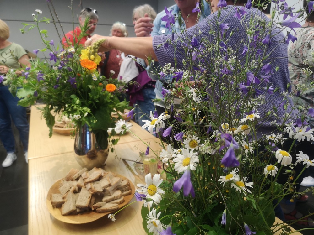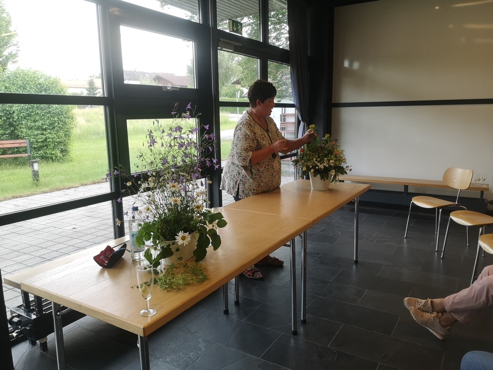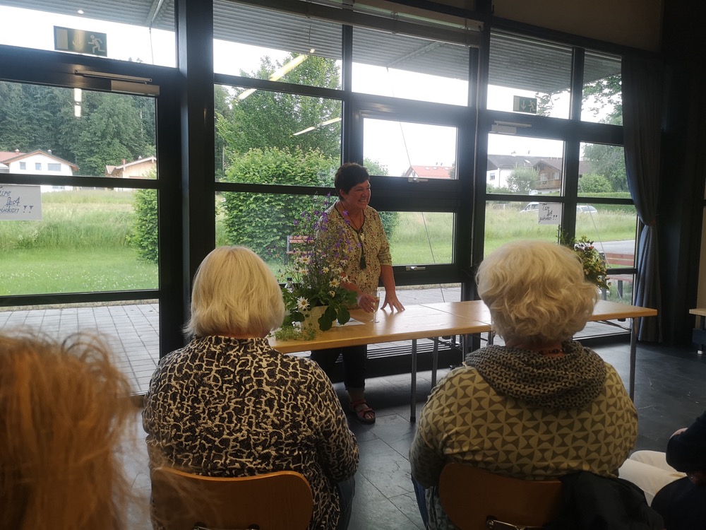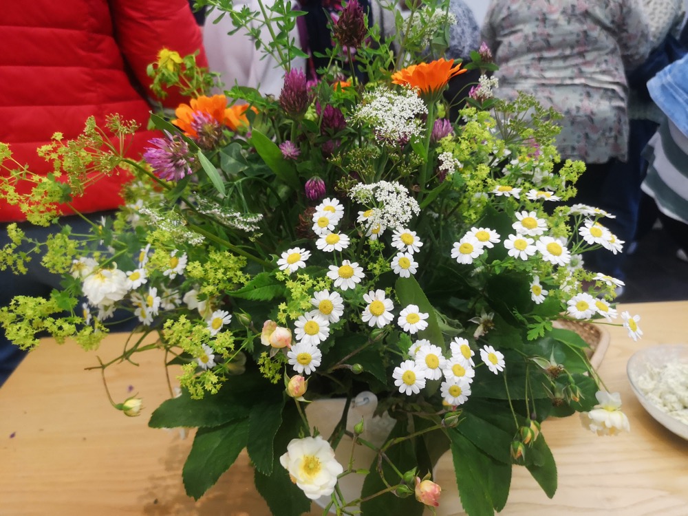 Anhand von Blumensträußen zeigte Rosmarie Pöschel die in der Region am häufigsten vorkommenden Pflanzen auf, die in unserer Natur wachsen und leicht zu finden sind. Trotz dieser Nähe und der leichten Erreichbarkeit gibt es wenig Wissen darüber, „wie“ und „wofür“ man diese Pflanzen verwenden kann.
