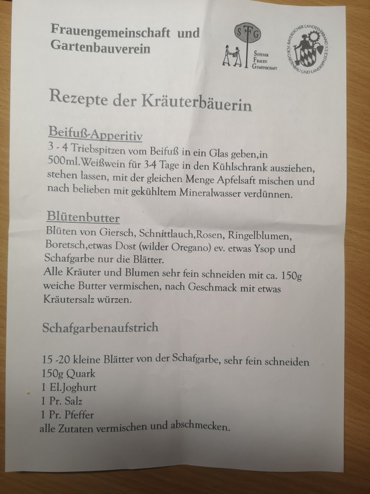 Wir möchten den beiden Vereinen für ihre hervorragende Arbeit danken, und uns für die gute Beteiligung und das Interesse der Teilnehmerinnen bedanken. Und hoffen, dass einige der Vorschläge zu Hause ausprobiert werden. Es gab einen Flyer mit vier Rezepten verteilt. Ideen für Löwenzahn-Butter und Kräuter-Limonade finden Sie auch in unserer Rubrik Gartenküche.