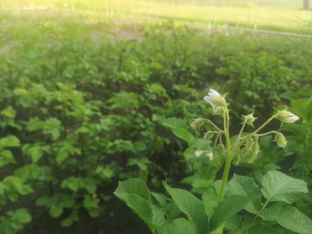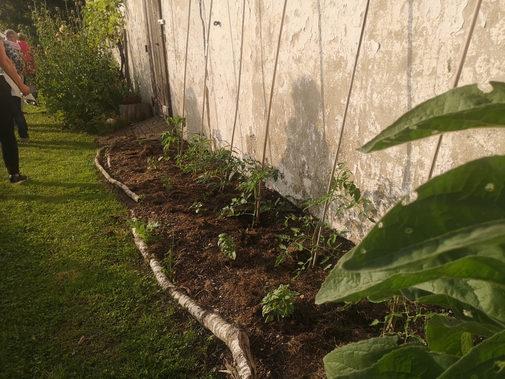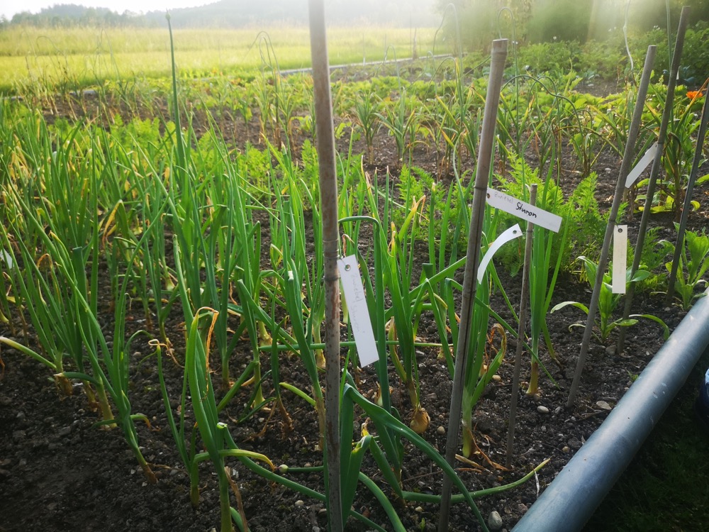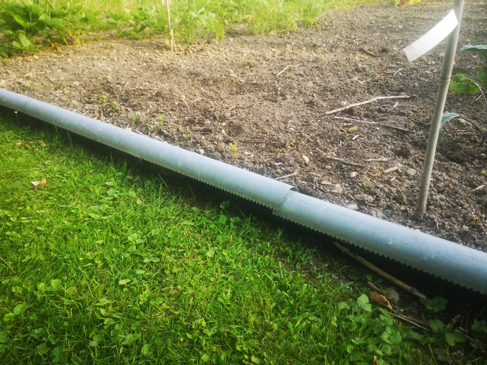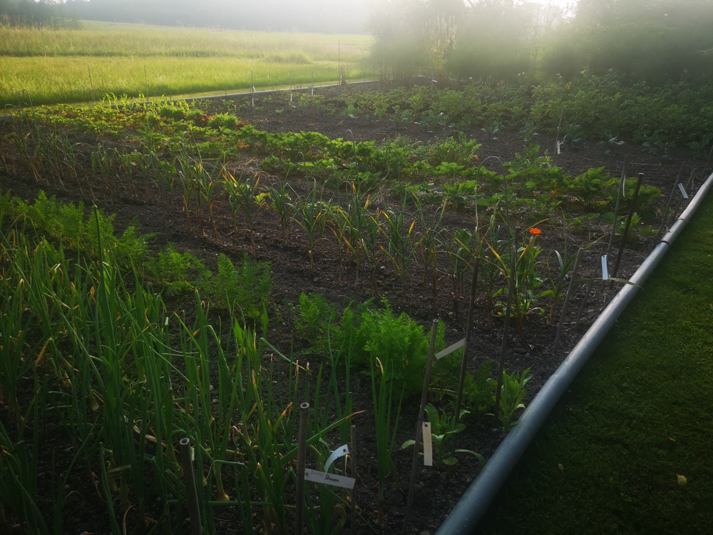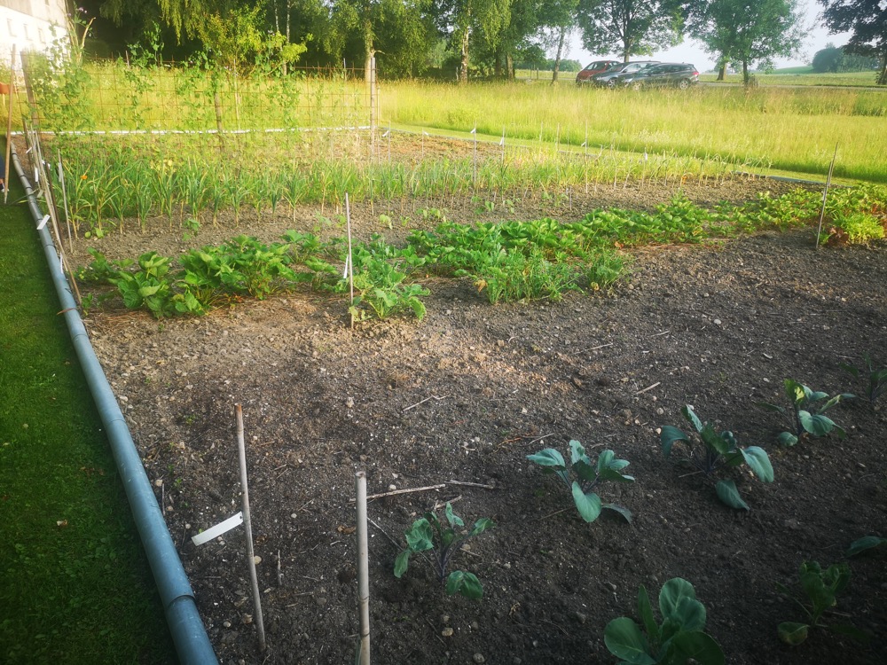 Die Kulturen sind in Reihen angeordnet und die Kulturen von Sorten wie z.B. Kartoffeln sind beschriftet (praktisches Markierungssystem). Die gesamte Fläche ist von der Rasenfläche mit Rasenkanten abgetrennt, die Unkraut und Schnecken kontrollieren.