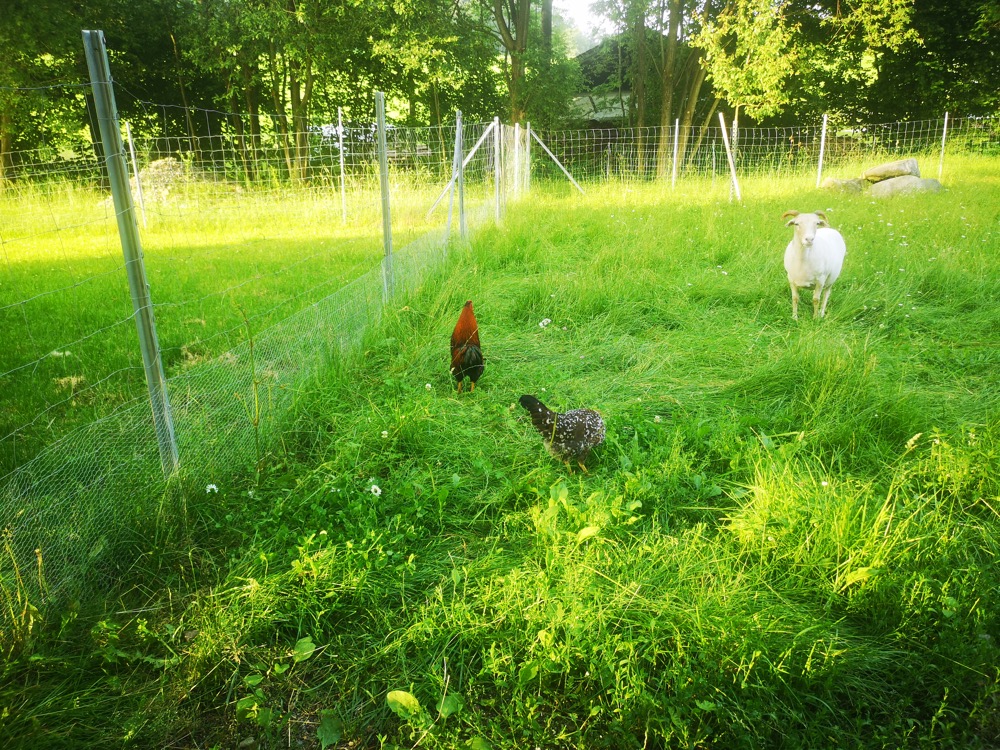 Auf einer Weide leben Hühner und Schafe freundschaftlich nebeneinander. Sie sind wichtig, weil sie zur Qualität des Komposts beitragen und die Vegetation unter Kontrolle halten, aber auch als Nahrungsquelle genutzt werden. Die Wolle der Schafe wird als Dünger verwendet. Neben dem Gras gibt es viele Brennessel und Wildpflanzen, die wichtig für Raupen und andere Insekten sind, sowie Steinhaufen, Totholz – Lebensräume für viele Tiere.