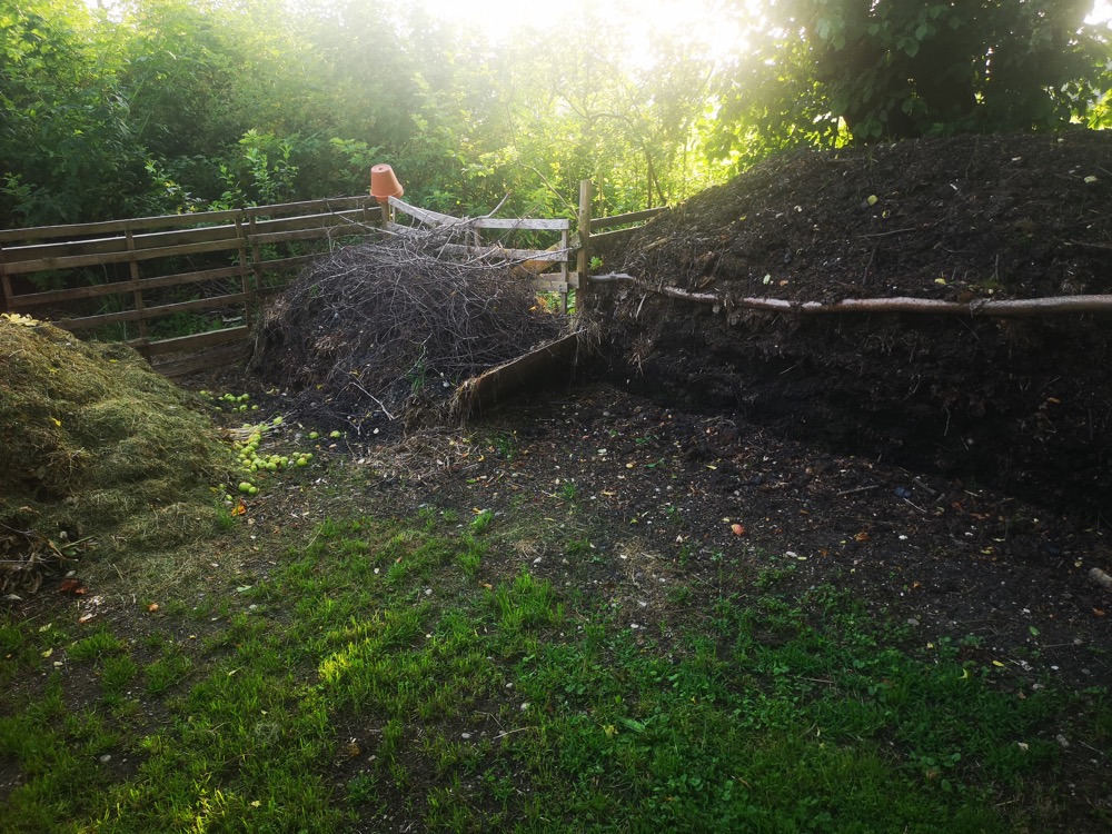 Im Schatten und geschützt durch die Vegetation befindet sich ein riesiger Komposthaufen und weiteres Material (grün und braun), um weitere Haufen zu füttern. Der Kompost wird umgesetzt und ist nach 2 Jahren fertig.
