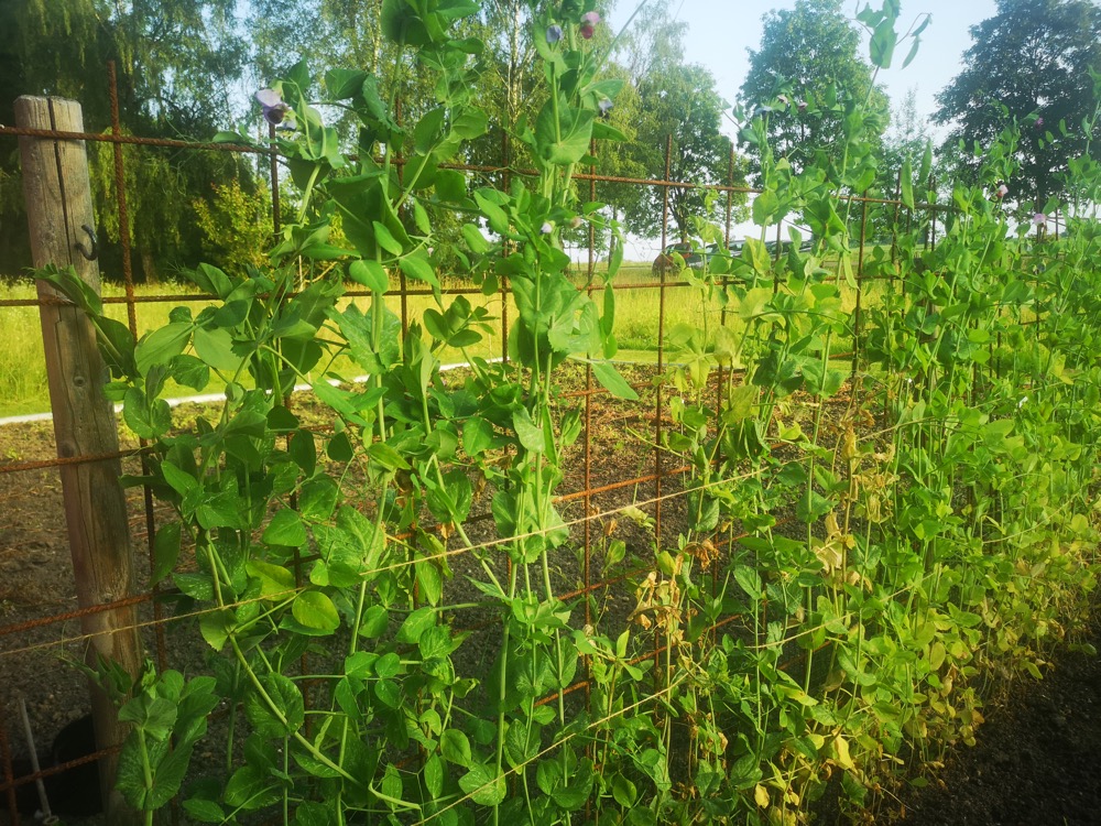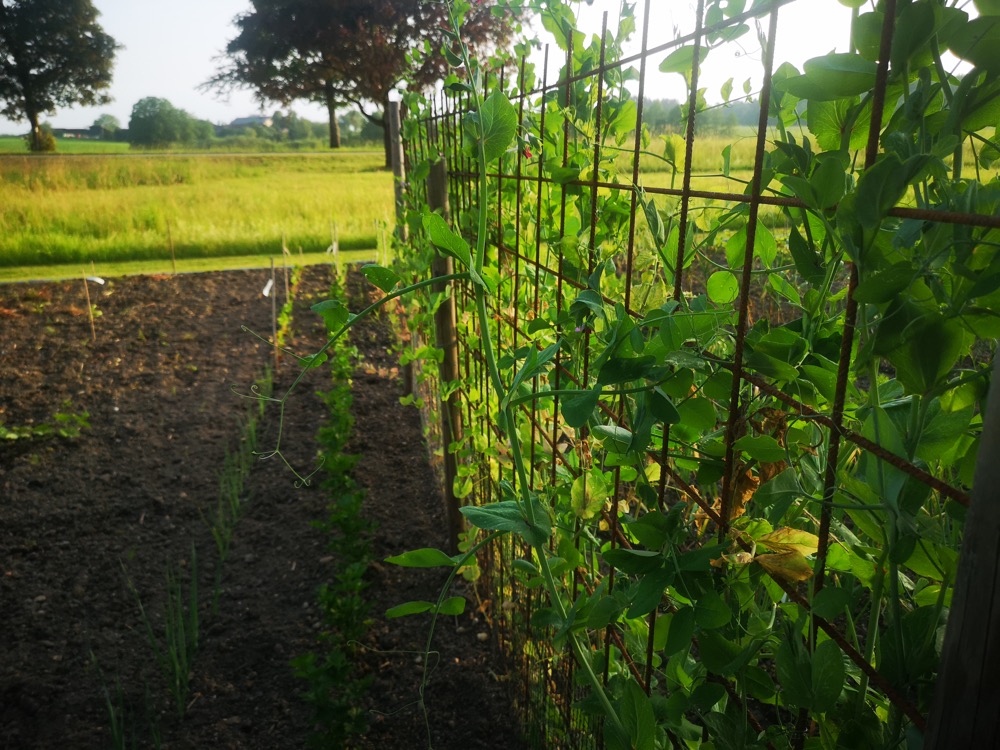Ein Metallnetz als Erbsenkletterer trennt geordnete Reihen (Kartoffel, Möhre, Zwiebeln, Knoblauch, Erdbeeren, Kohl, Sellerie) von der frei wachsenden Zone für Kürbis, Zucchini usw.