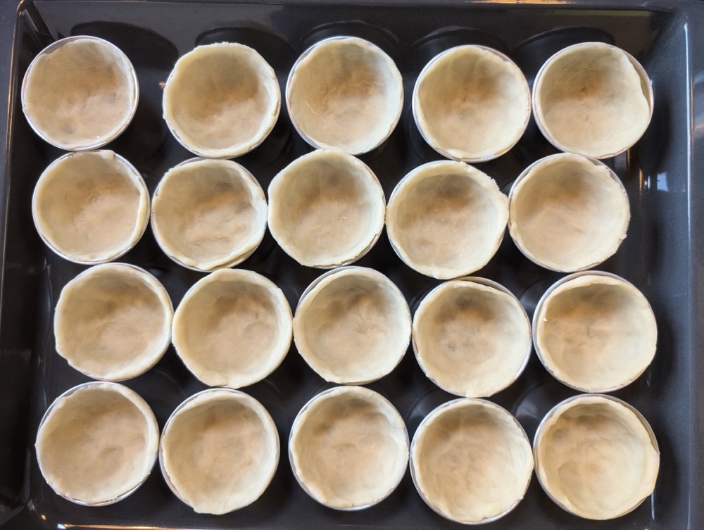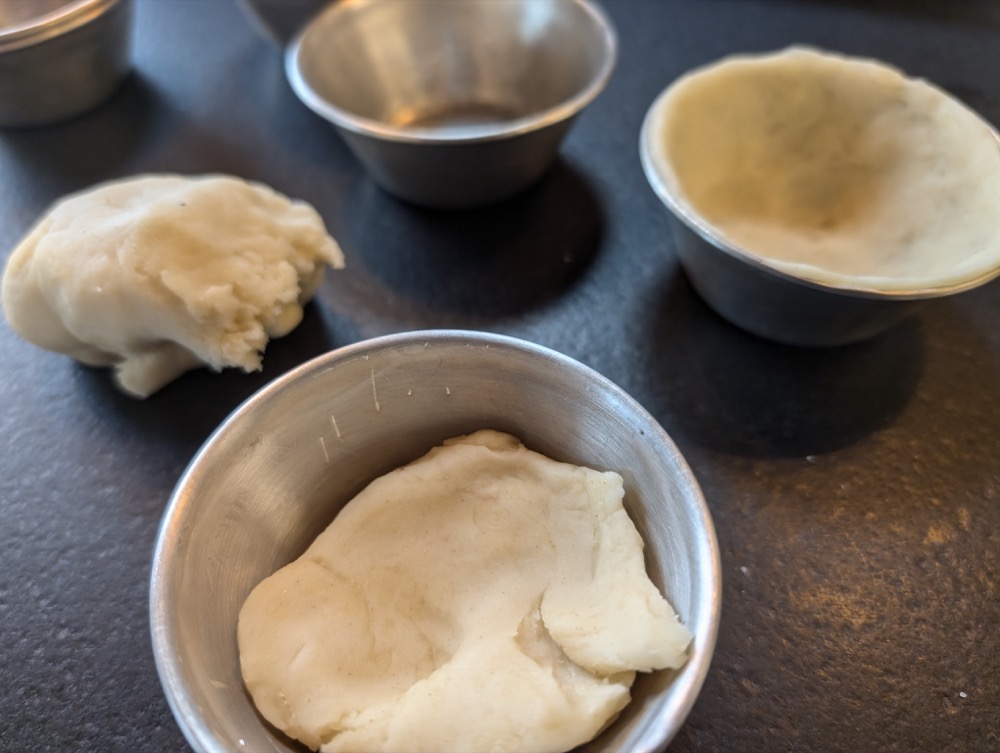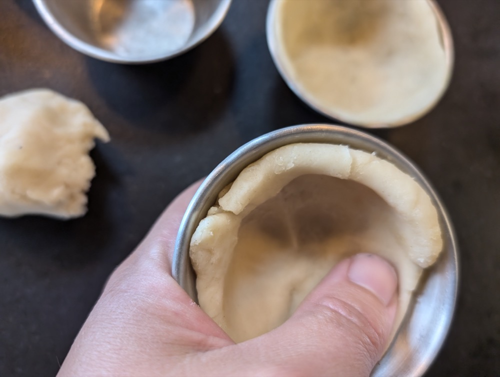 Jede Scheibe in den Boden der Form legen und mit einem mit Wasser angefeuchteten Daumen auskleiden. Vor dem Füllen etwa 10 Minuten kühl stellen.