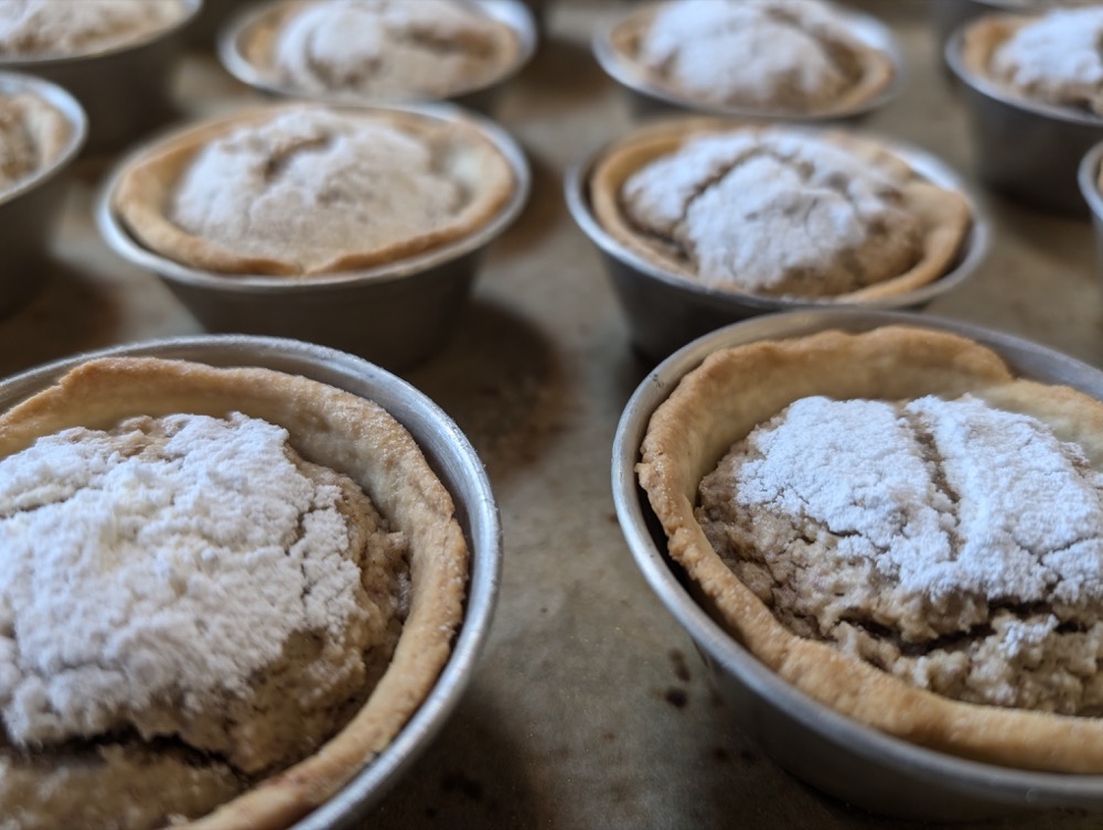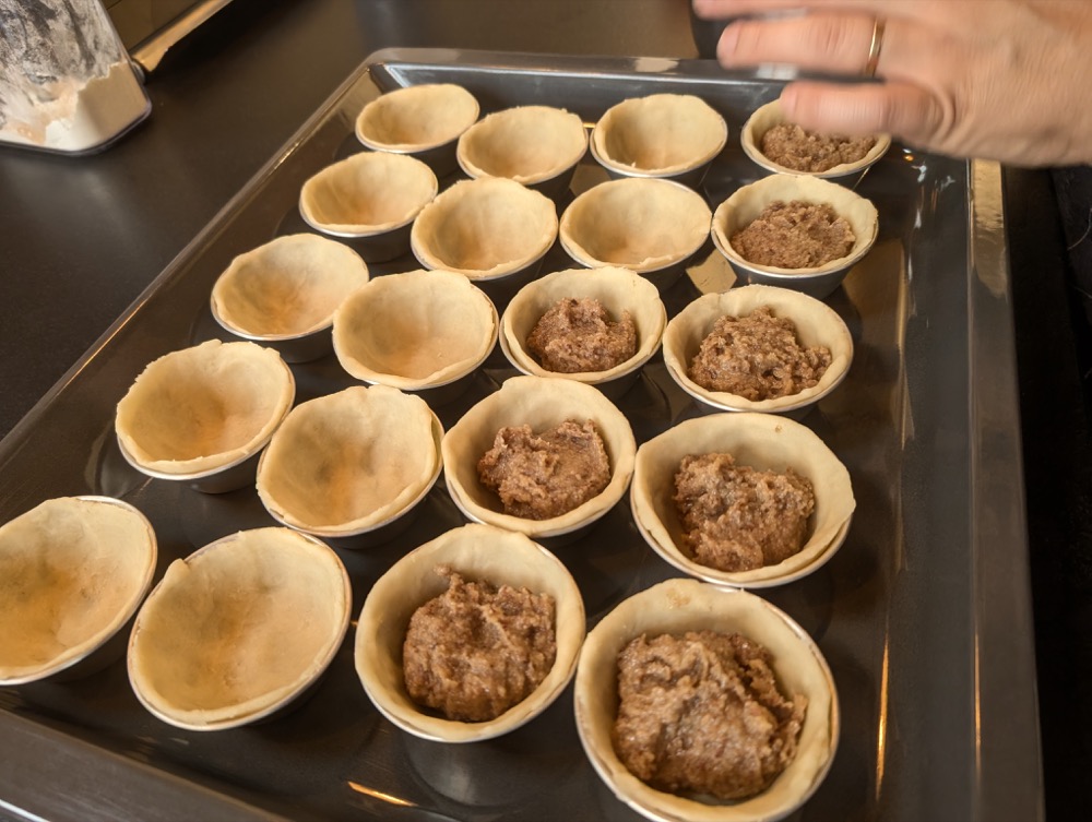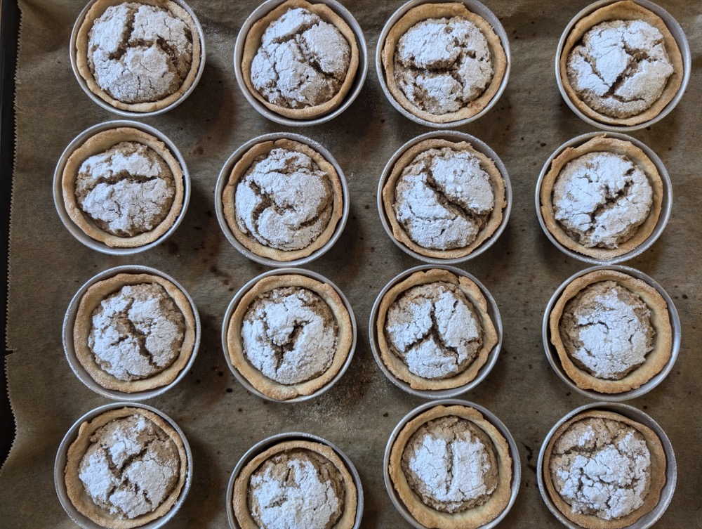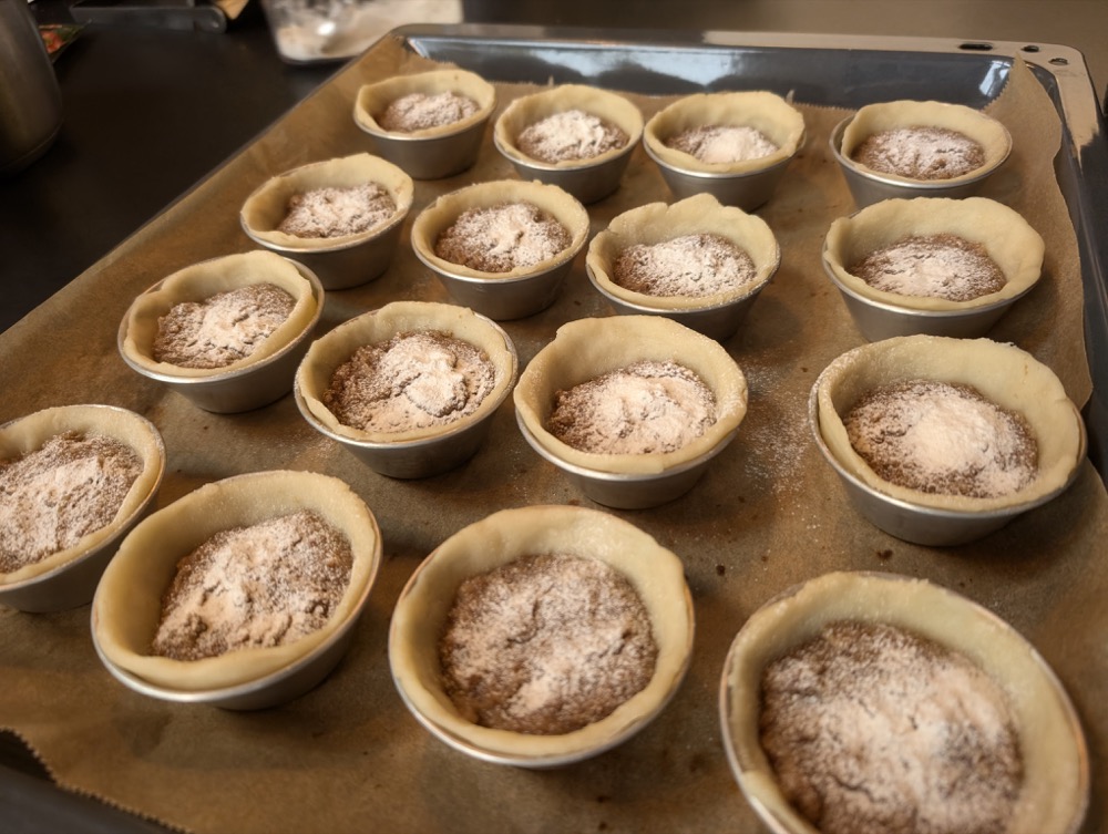 Die Förmchen mit der Füllung befüllen. Leicht mit Mehl bestäuben und dann reichlich mit Puderzucker bestreuen.